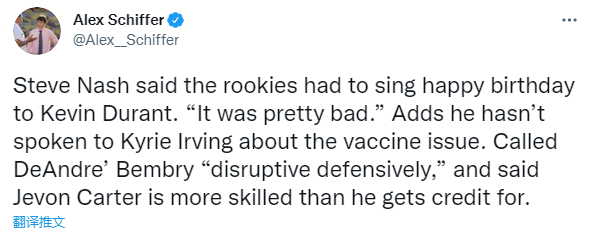 篮网官方晒照恭喜杜兰特生日快乐,发推写道:布鲁克林,帮我们祝贺杜兰特生日快乐;据名记alex schiffer报道,纳什透露球队新秀为杜兰特唱生日歌,新秀唱的很糟糕很难听,纳什还表示他还没有和欧文谈过关于疫苗的问题,称赞本布里的防守,直言杰文-卡特的技术很好,超过了自己的预期。