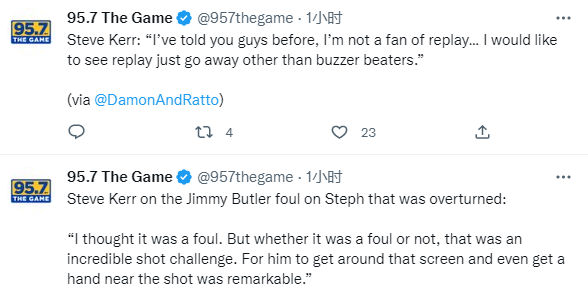 昨天勇士输球后,库里直言裁判的吹罚太糟糕,而今天对于这争议吹罚,科尔表示:我认为那是一个犯规,但不管那是不是犯规,巴特勒的那次防守都是不可思议的,他能绕过掩护,甚至还把手伸到那个位置去干扰库里出手,非常了不起。我之前就告诉过你们,我不喜欢录像回放挑战,我只希望看到这个规则彻底消失。
