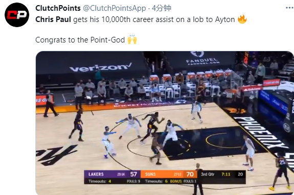 美媒Clutch Points发推写道:恭喜控卫之神;太阳官方连续更新动态,写道:我们爱我们的控卫,控卫之神;保罗助攻艾顿解锁神迹,回到太阳替补席,保罗拥抱克劳德,并且和众队友击掌庆祝。